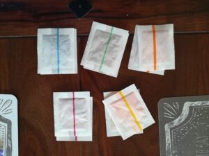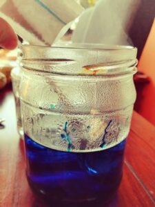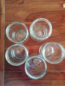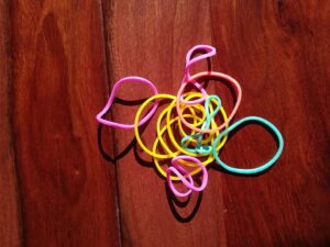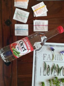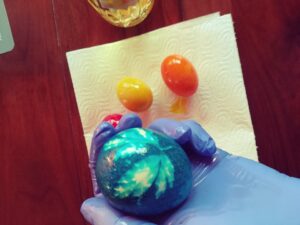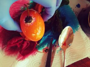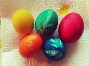 Barwniki do jaj, gumki recepturki stare pończochy, ocet, słoiczki na barwniki.