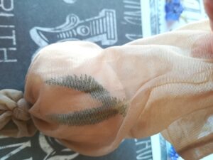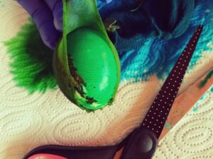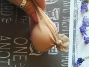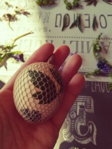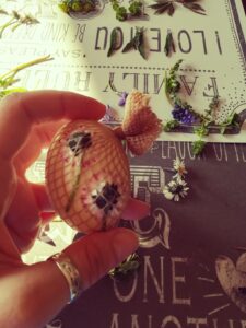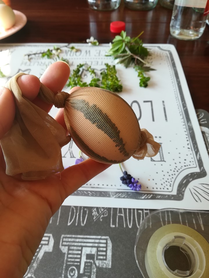 Do wcześniej ugotowanych jaj przykładamy roślinki, listki kwiatki i na jajo naciągamy kawałek rajstopki, tak aby wszystko ładnie przylegało do jaja.