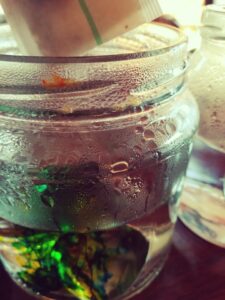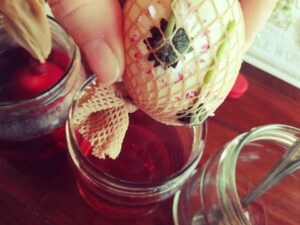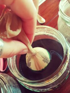Teraz już tylko czekamy i czekamy aż jajeczka się zabarwią Gdy już osiągnął wymagany kolor, wyciągamy z słoiczków, zdejmujemy pończochy i listki.