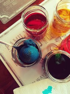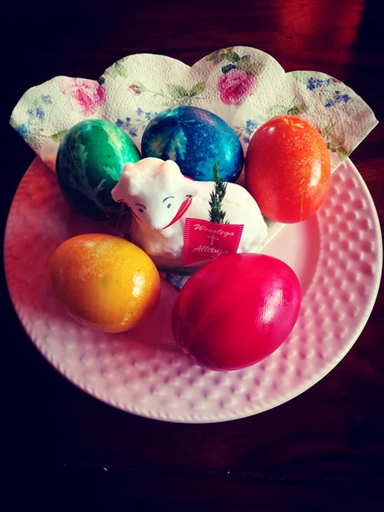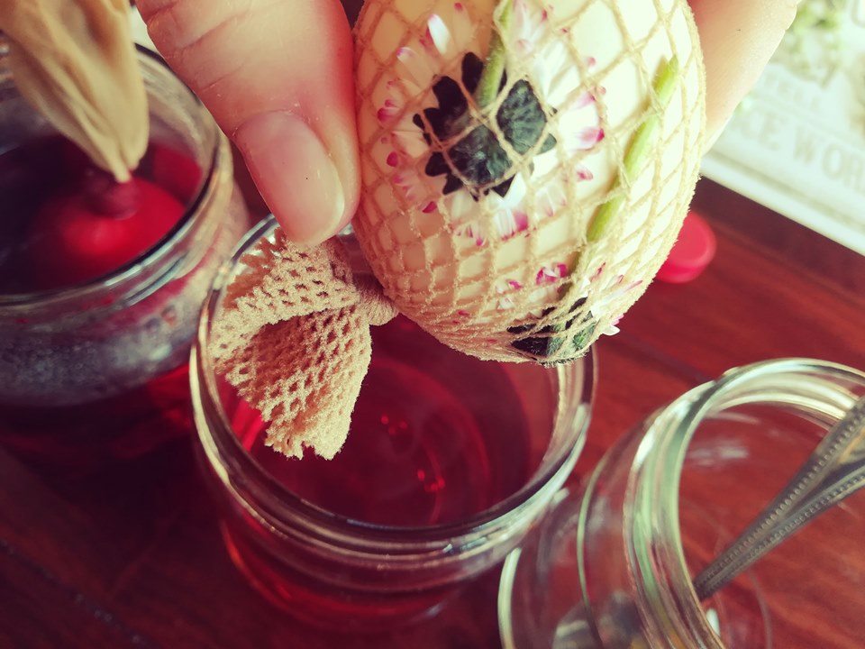 Następnie do przygotowanych barwników wkładamy jajka, pamiętajcie aby do wody dodać też łyżkę octu