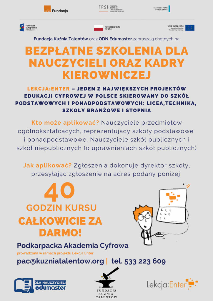Fundacja Kuźnia Talentów od marca 2021 r. realizuje projekt grantowy Podkarpacka Akademia Cyfrowa w ramach jednego z największych projektów edukacyjnych w Polsce o nazwie Lekcja:Enter.