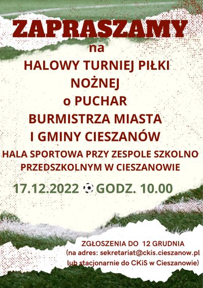 HALOWY TURNIEJ PIŁKI NOŻNEJ O PUCHAR BURMISTRZA MIASTA I GMINY CIESZANÓW – 17.12.2022 10:00